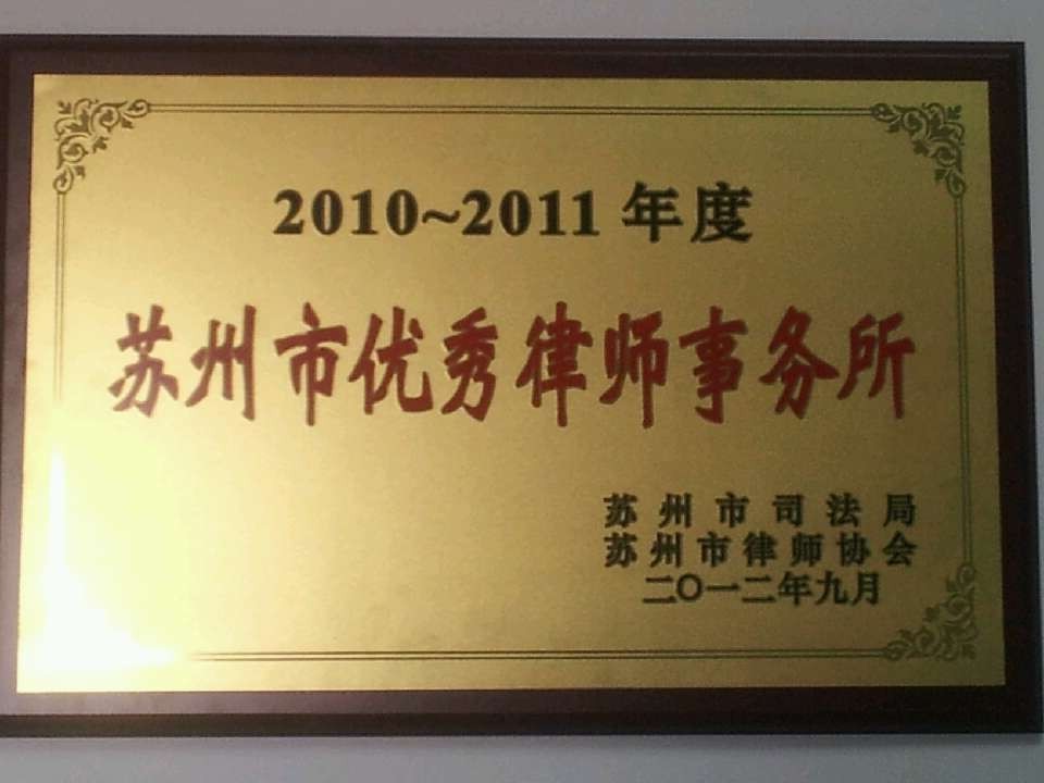 江苏久顺律师事务所于2012年9月被苏州市司法局、苏州市律师协会评为2010-2011年度苏州市优秀律师事务所。