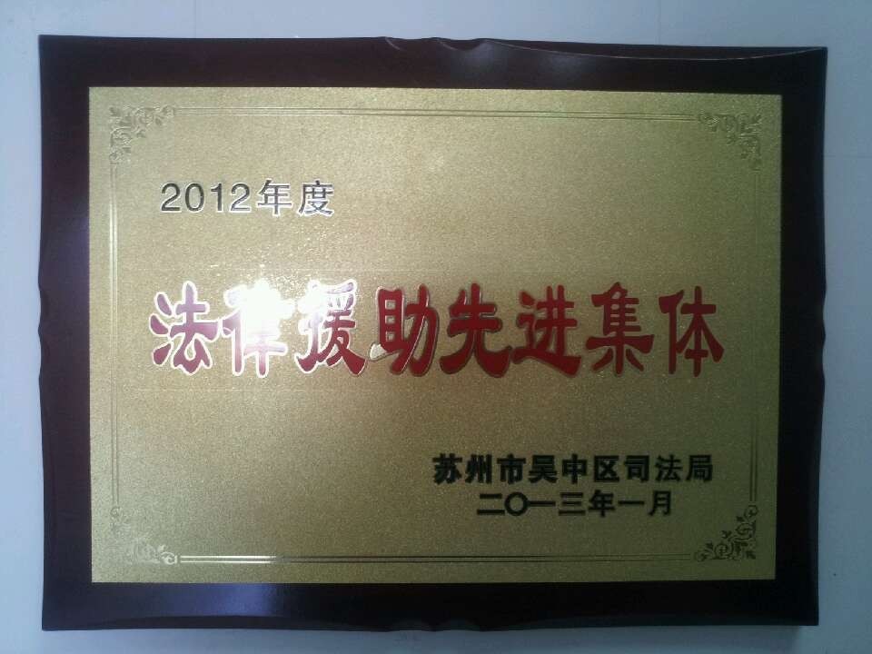 江苏久顺律师事务所被苏州市吴中区司法局评为2012年年度法律援助先进集体。