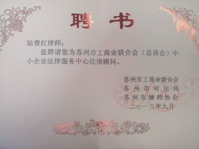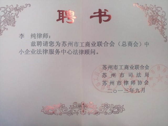 2013年9月18日,苏州市工商业联合会(总商会)中小企业法律服务中心成立,我所主任陆费红律师、副主任李纯律师被聘请为中心法律顾问。