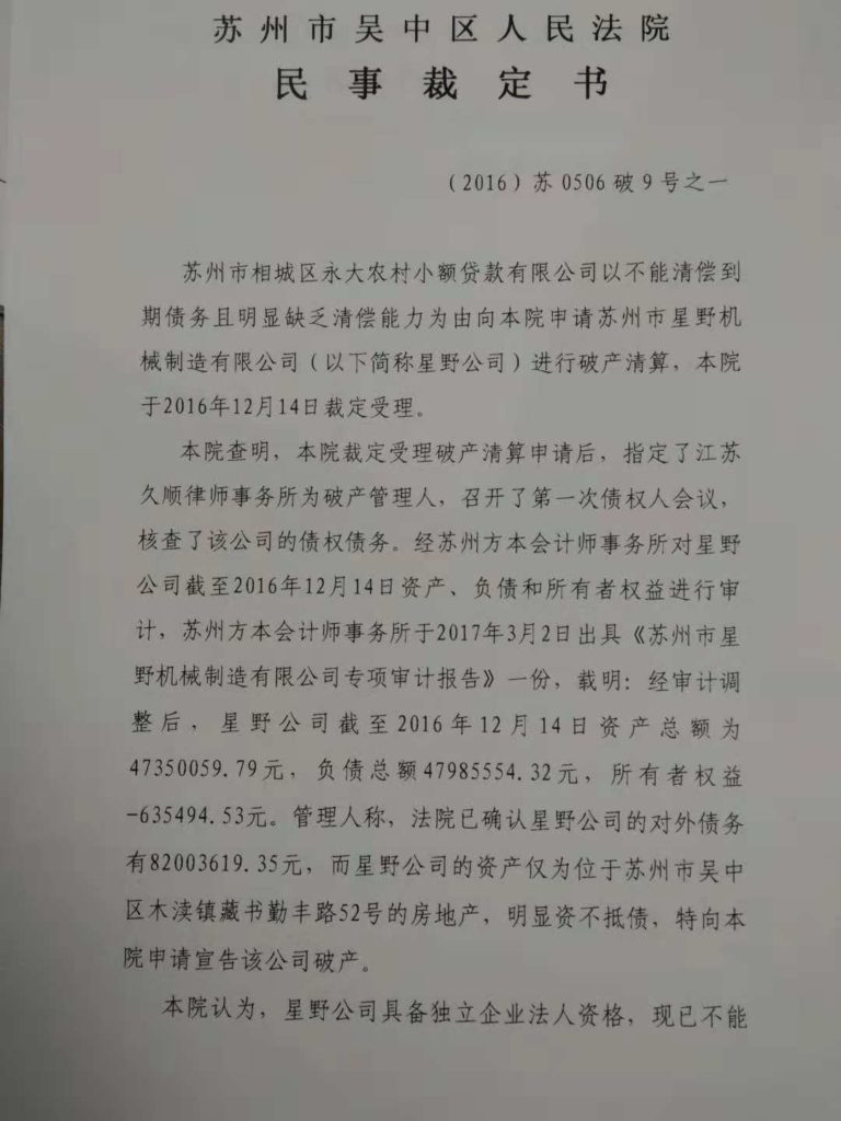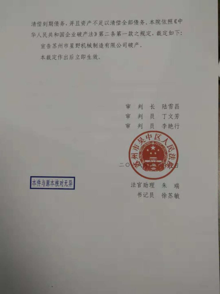 苏州市星野机械制造有限公司已于2018年11月8日被苏州市吴中区人民法院宣告破产,民事裁定书后附。