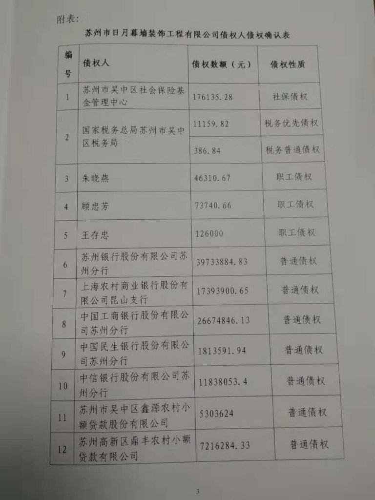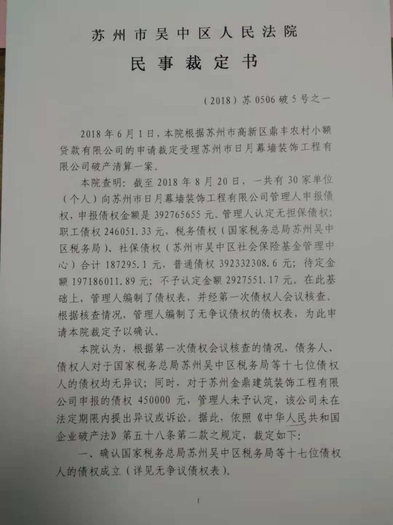 苏州市吴中区人民法院于2018年6月1日根据苏州市高新区鼎丰农村小额贷款有限公司的申请裁定受理苏州市日月幕墙装饰工程有限公司破产清算一案。现苏州市吴中区人民法院已于2018年11月7日作出(2018)苏0506破5号之一《民事裁定书》,对本案债权人的债权进行了确认。裁定书后附。