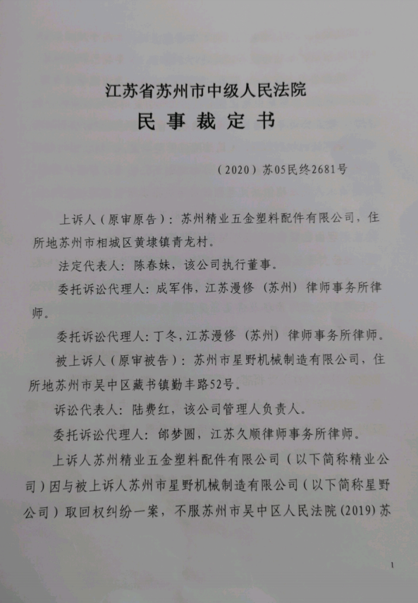 苏州市星野机械制造有限公司相关诉讼案件情况公示