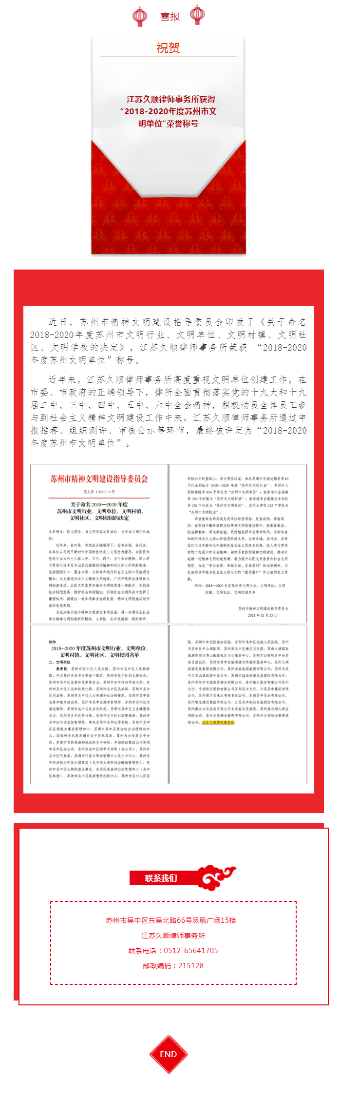 喜报|江苏久顺律师事务所获得“2018-2020年度苏州市文明单位”荣誉称号