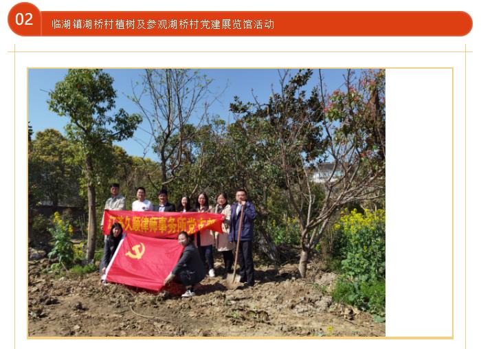 为深入贯彻党的十九大精神,以实际行动践行“青山绿水就是金山银山”的推进生态文明建设精神,江苏久顺律师事务所党支部于2021年3月26日上午前往临湖镇湖桥村开展“公益植树”植树互绿主题当日活动。在这春回大地,万物复苏的三月,号召全体党员同志从我做起,从小事做起,美化环境,共创绿色家园。
